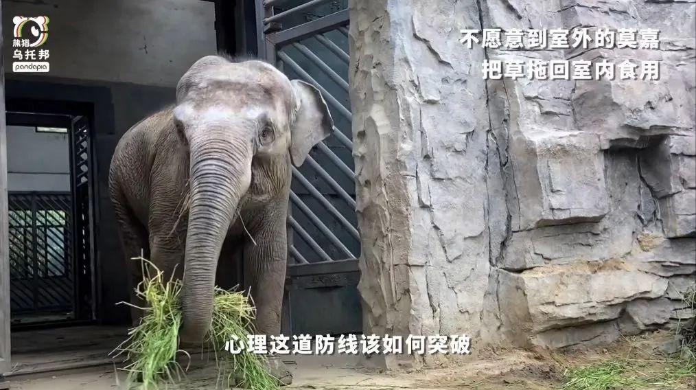 刚到成都动物园时,莫嘉精神十分紧张,走进内室后就不敢再出去,哪怕身体不断向前倾,不断尝试,脚却还是停留在原地。
