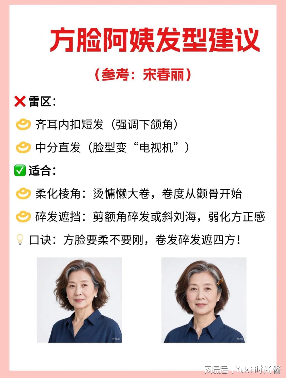 方脸型:柔化棱角,烫慵懒大卷,卷度从颧骨开始,碎发遮挡,剪额角碎发或斜刘海,弱化方正感。