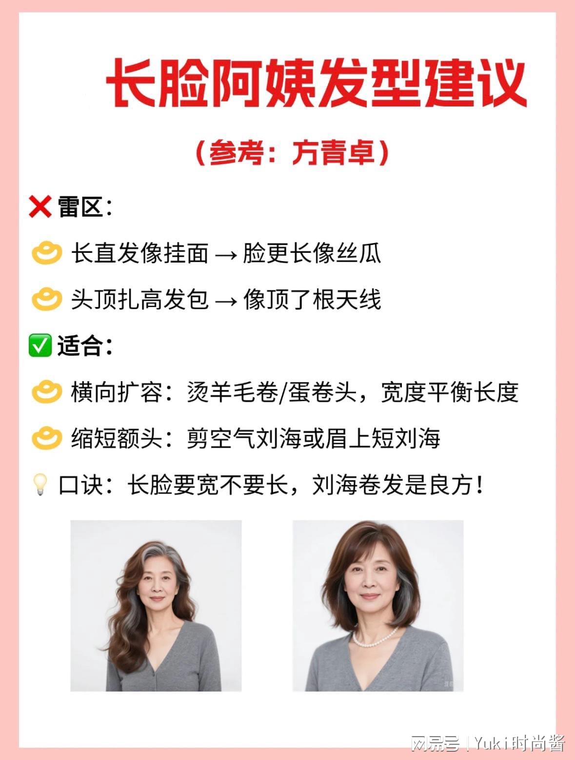 长脸型:横向扩容,烫羊毛卷/蛋卷头,宽度平衡长度,缩短额头,剪空气刘海或眉上短刘海。