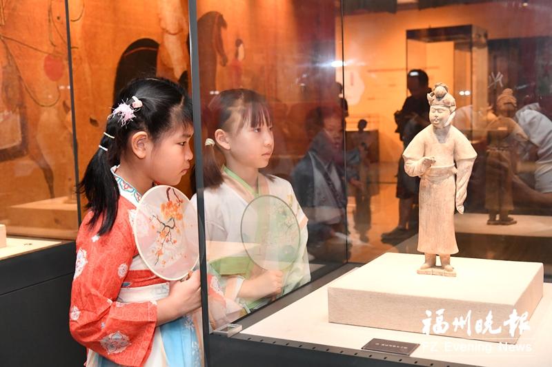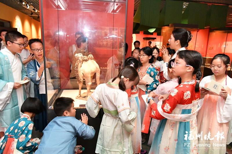此次在福州举办的“大唐金乡县主展”,衣着配饰华丽人物俑以及造型逼真动物俑,塑造艺术高超、烧造艺术精湛,被考古专家推测为盛唐时期“东园秘器”的代表作品,它们展示了一个物阜民丰的唐代社会,也为小营员领略“长安气象”打开了一扇窗口。