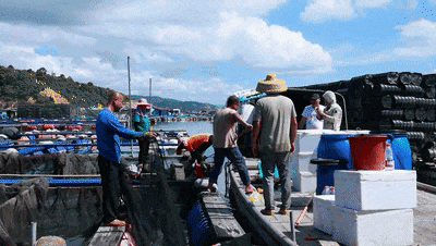 在鉴江镇井水村的绿鳍马面鲀养殖鱼排上,一派丰收忙碌的景象。记者在现场看到,工人们正有条不紊地开展起网捕捞作业,鲜活肥美的绿鳍马面鲀不断从水中跃出,活力十足。捕捞后,工人们迅速对鱼体进行放血去腥处理,随即装箱覆冰保鲜,通过冷链物流直送加工工厂,进入后续生产环节。