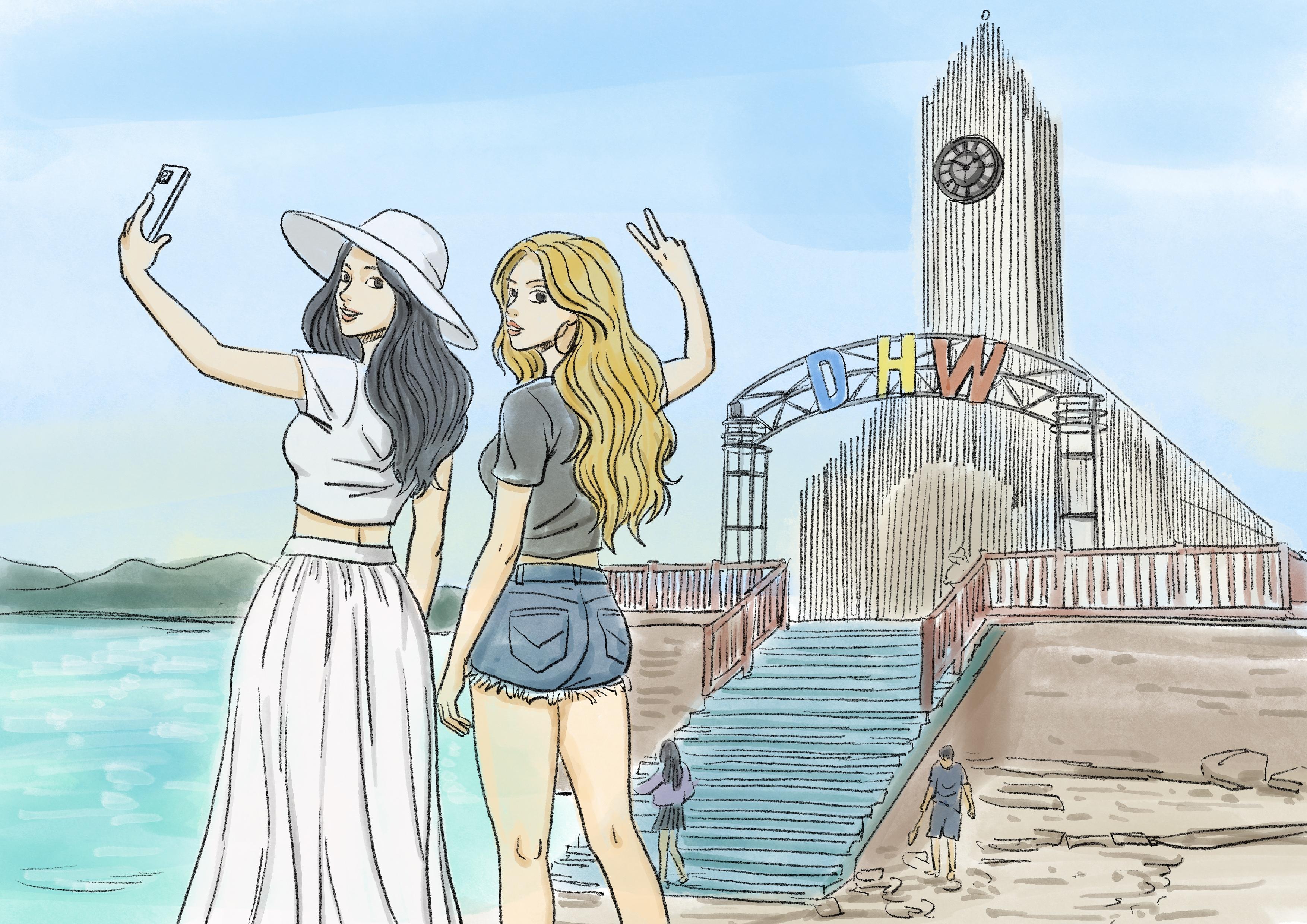 登上“巨轮”观景台,海湾尽收眼底。海岸蜿蜒,人潮涌动。细软白沙亲吻着脚趾,孩子们卷起裤管,奔跑、铲沙。观景台上、棕榈树下、游泳池边,人们玩水嬉戏,留影记游。