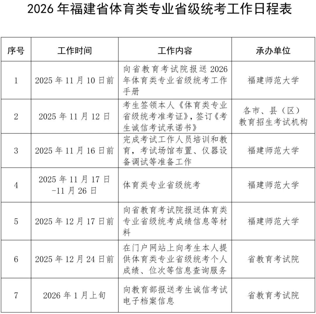 日前,省教育厅印发《关于做好2026年普通高校招生体育类专业省级统一考试工作的通知》,明确2026年福建省普通高校招生体育类专业省级统一考试(以下简称体育类专业省级统考)将于2025年11月17日—11月26日进行。