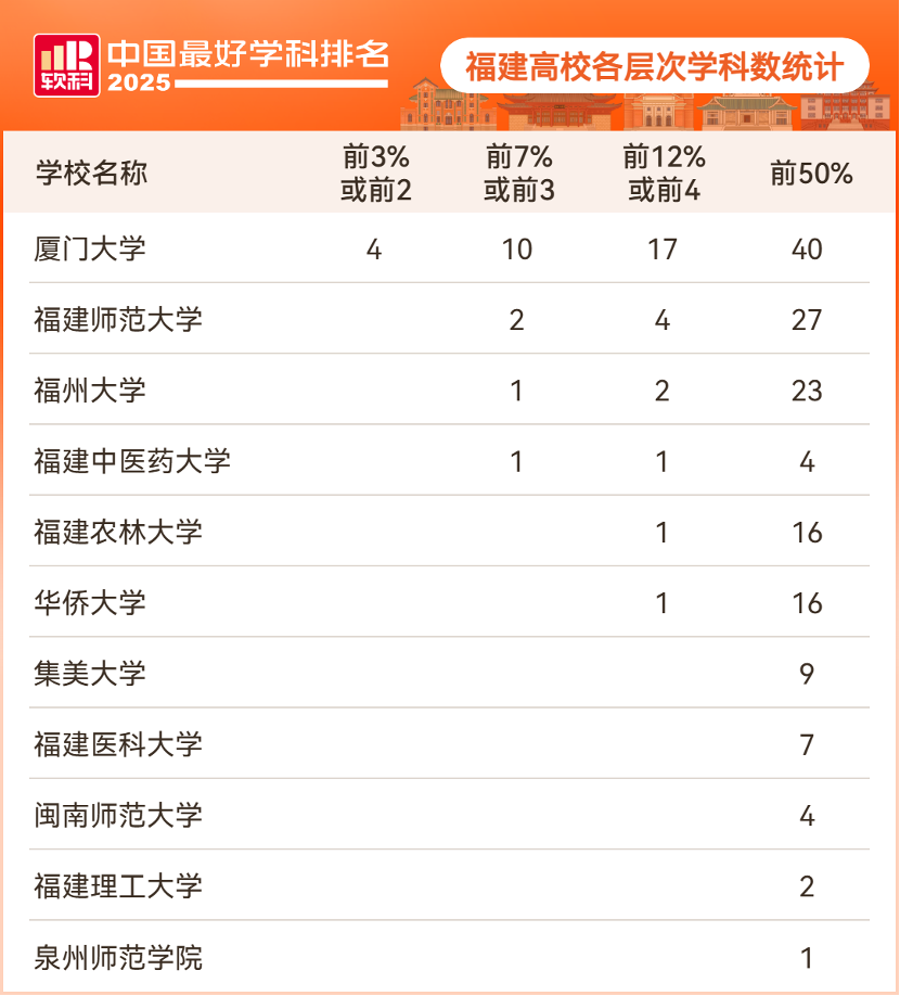 在2025软科中国最好学科排名中,福建共有11所高校149个学科上榜,其中包括139个一级学科和10个专业学位类别。此次,福建共有26个中国一流学科(含一级学科和专业学位类别),并拥有4个中国顶尖学科。