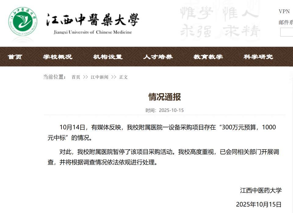 300万元预算,1000元中标?江西中医药大学回应:暂停采购