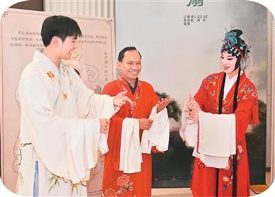 印尼嘉宾(中)与闽剧电影《双蝶扇》演员互动。张旭阳 摄