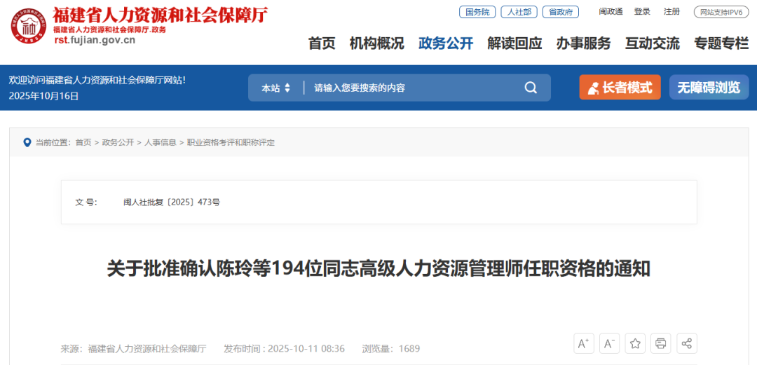 近日,福建省人力资源和社会保障厅发布了关于批准确认陈玲等194位同志高级人力资源管理师任职资格的通知。一起来看——