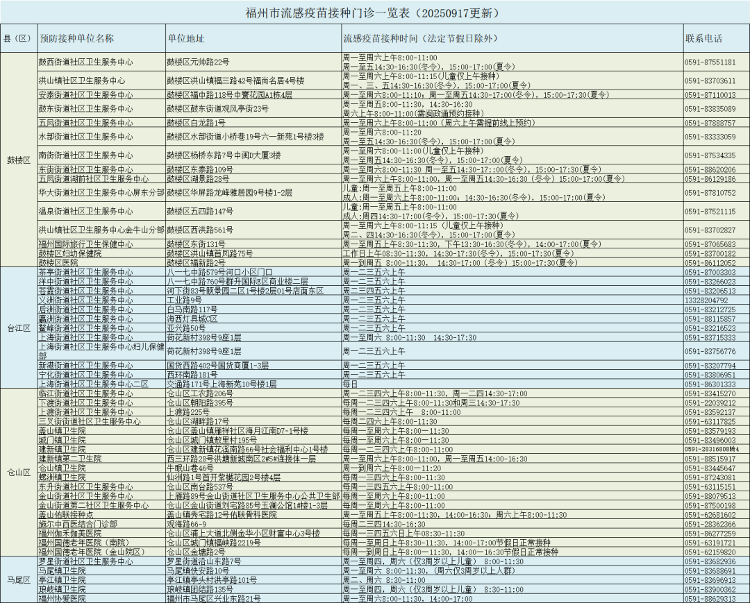 目前福州各县(市)区预防接种门诊流感疫苗已到货,具体接种事宜可提前向辖区接种门诊咨询。