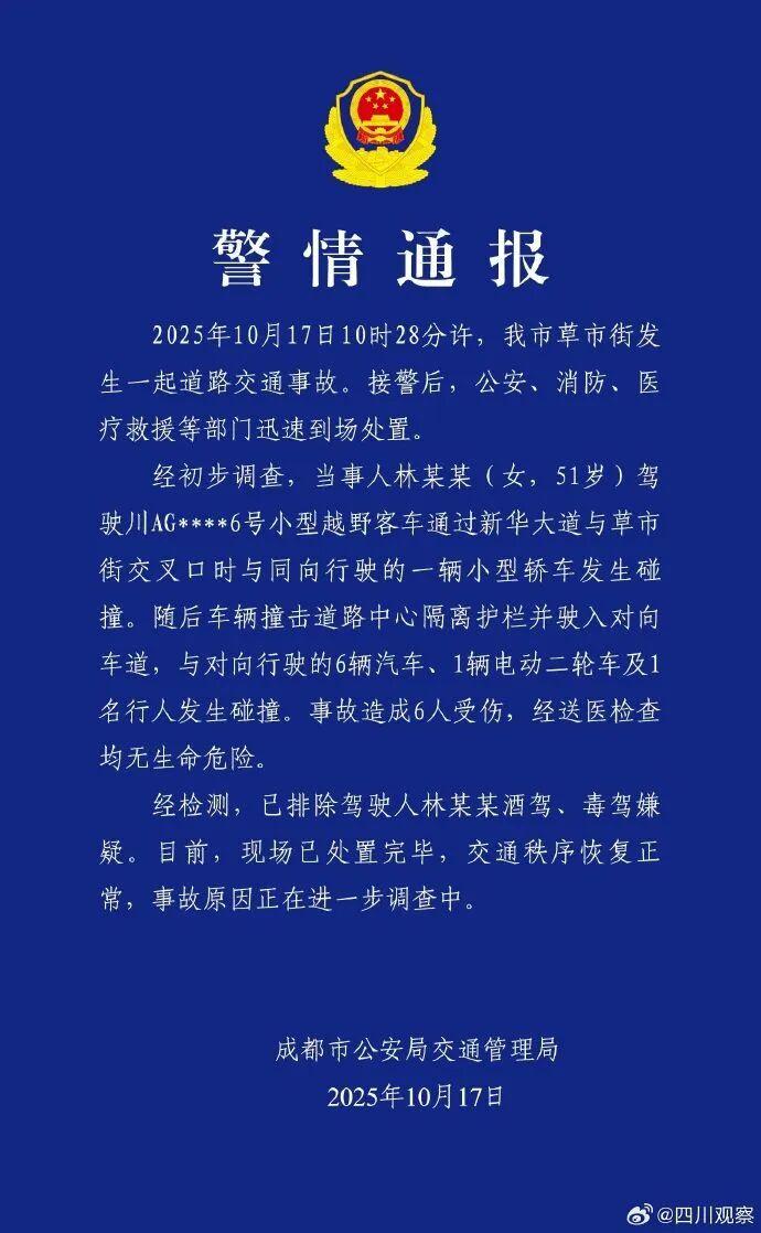 经初步调查,当事人林某某(女,51岁)驾驶川AG****6号小型越野客车通过新华大道与草市街交叉口时与同向行驶的一辆小型轿车发生碰撞。随后车辆撞击道路中心隔离护栏并驶入对向车道,与对向行驶的6辆汽车、1辆电动二轮车及1名行人发生碰撞。事故造成6人受伤,经送医检查均无生命危险。