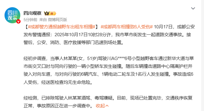 10月17日,成都公安发布警情通报:2025年10月17日10时28分许,我市草市街发生一起道路交通事故。接警后,公安、消防、医疗救援等部门迅速到场处置。