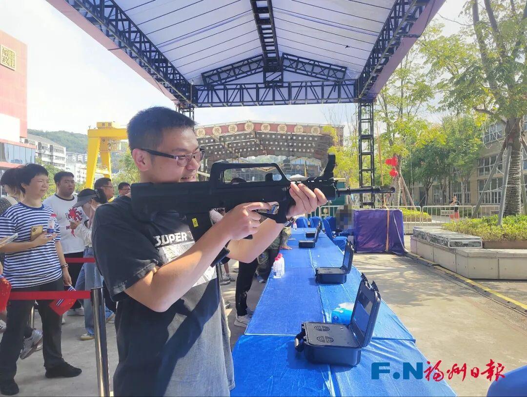 “9.5环”“9.8环”……现场有95式步枪和92式手枪1:1仿真模型,市民在官兵指导下体验射击,报靶声此起彼伏。