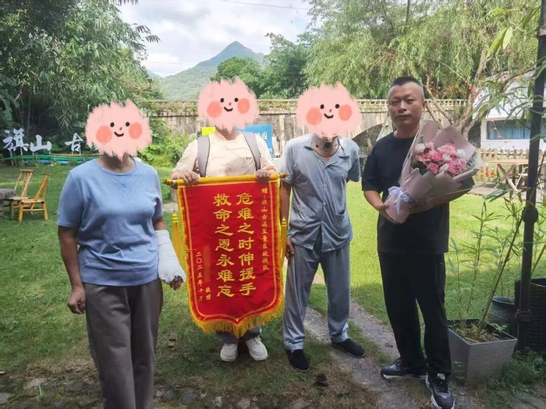 10月16日,周先生携父母专程前往旗山古溪里景区,将锦旗赠予救命恩人。旗山古溪里景区供图