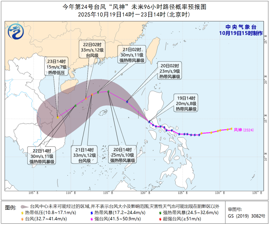 今年第24号台风“风神”即将进入南海东部海面。中央气象台10月19日10时继续发布台风蓝色预警: