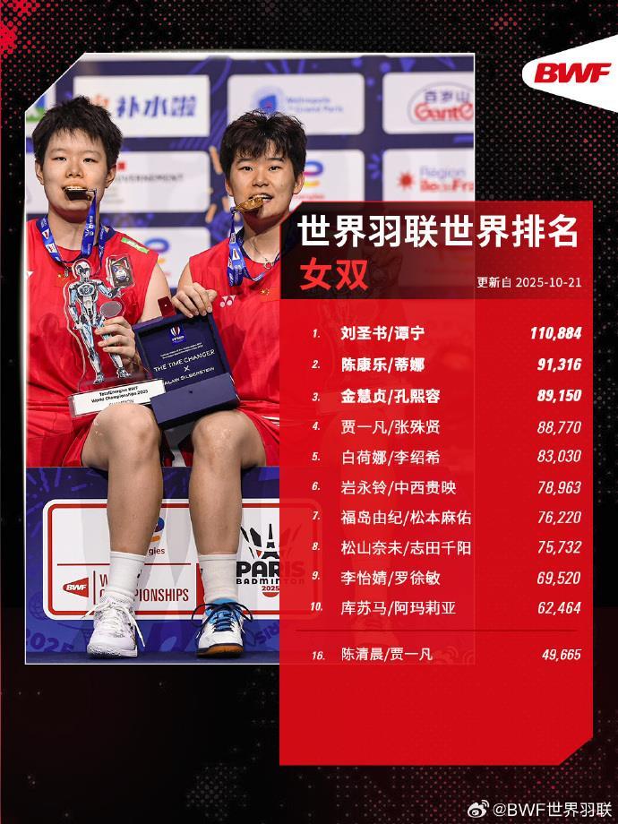 世界羽联2025年第43周世界排名揭晓,中国队强势包揽三项世界第一:石宇奇(男单)、刘圣书/谭宁(女双)、蒋振邦/魏雅欣(混双)均以10万+高分继续领跑各单项第一。