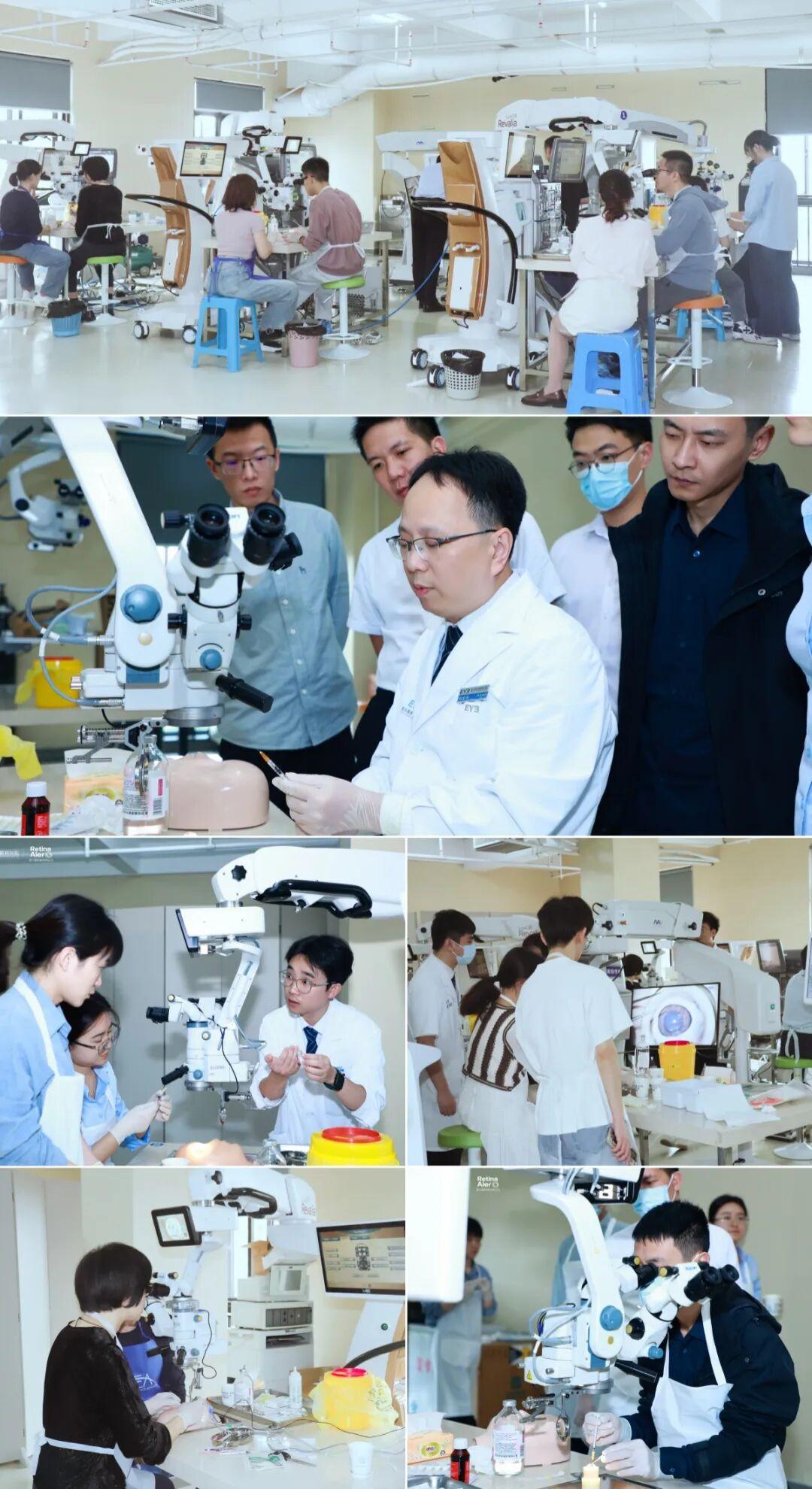 培训现场,福州爱尔眼科医院眼底病科郑宏华主任、周舞啸医生、吕博荣医生“手把手”带教,并现场答疑,让学员进一步掌握玻切手术及可折叠球囊外加压手术的规范化操作,提高手术实践能力。