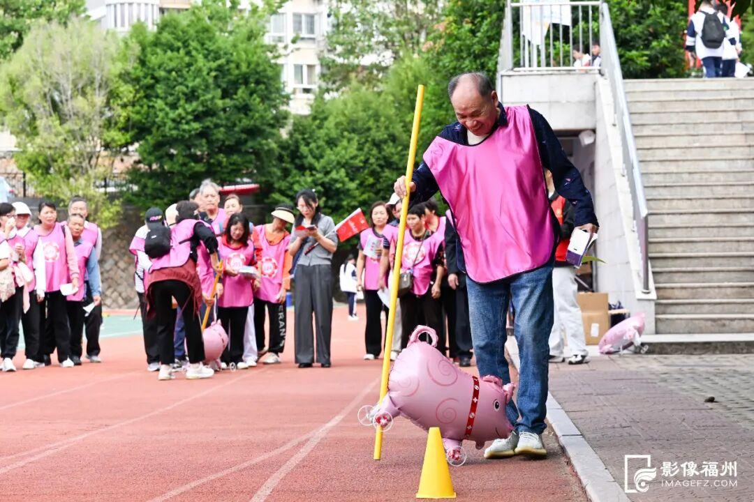 ▲在福建经济学校的绿茵操场上,老人们在志愿者的陪伴下挑战五大趣味项目。池远/摄