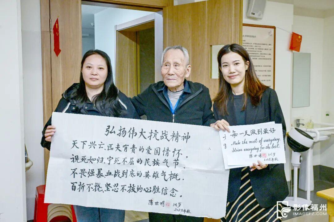 ▲10月28日,101岁的陈世明(中)展示他的书法作品。石美祥/摄