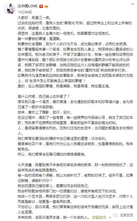 江一燕随后发文致歉,称自己会积极配合相关部门的一切调查约谈,接受所有规范下的决定。