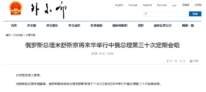 应国务院总理李强邀请,俄罗斯联邦政府总理米舒斯京将于11月3日至4日来华举行中俄总理第三十次定期会晤。