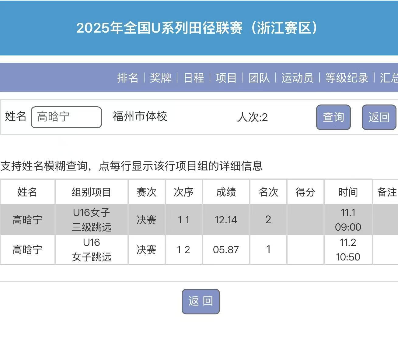 高晗宁斩获2025全国U系列田径联赛U16组女子跳远冠军和三级跳远亚军 受访者供图
