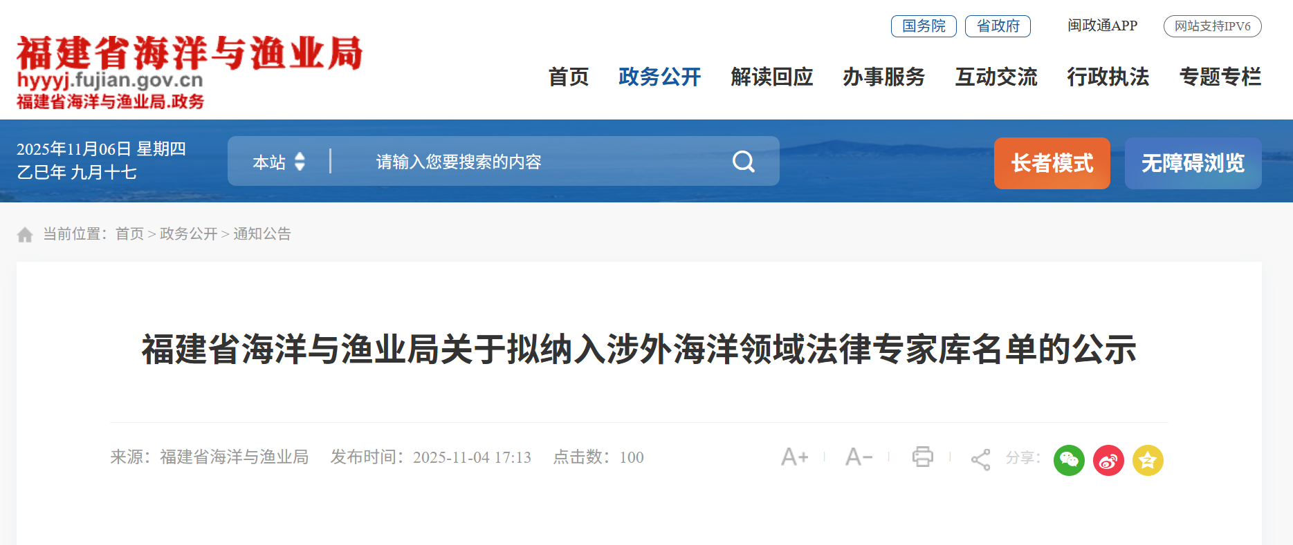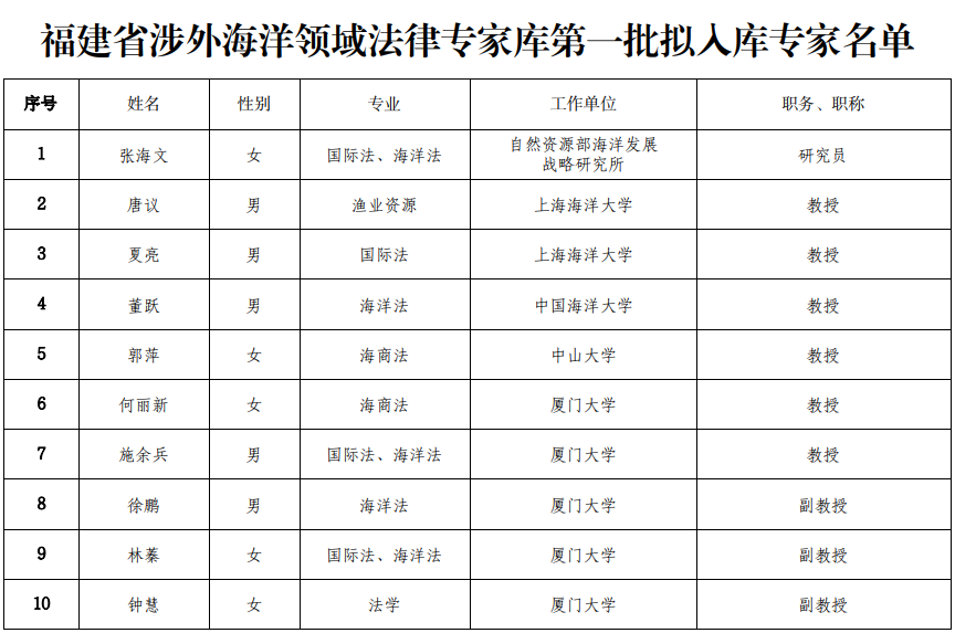 近日,福建省海洋与渔业局公示福建省涉外海洋领域法律专家库第一批拟入库专家名单,公示时间为11月4日至11月10日。一起来看完整名单↓↓