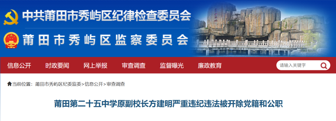 日前,经中共莆田市秀屿区委批准,莆田市秀屿区纪委监委对莆田第二十五中学原副校长方建明严重违纪违法问题进行了立案审查调查。