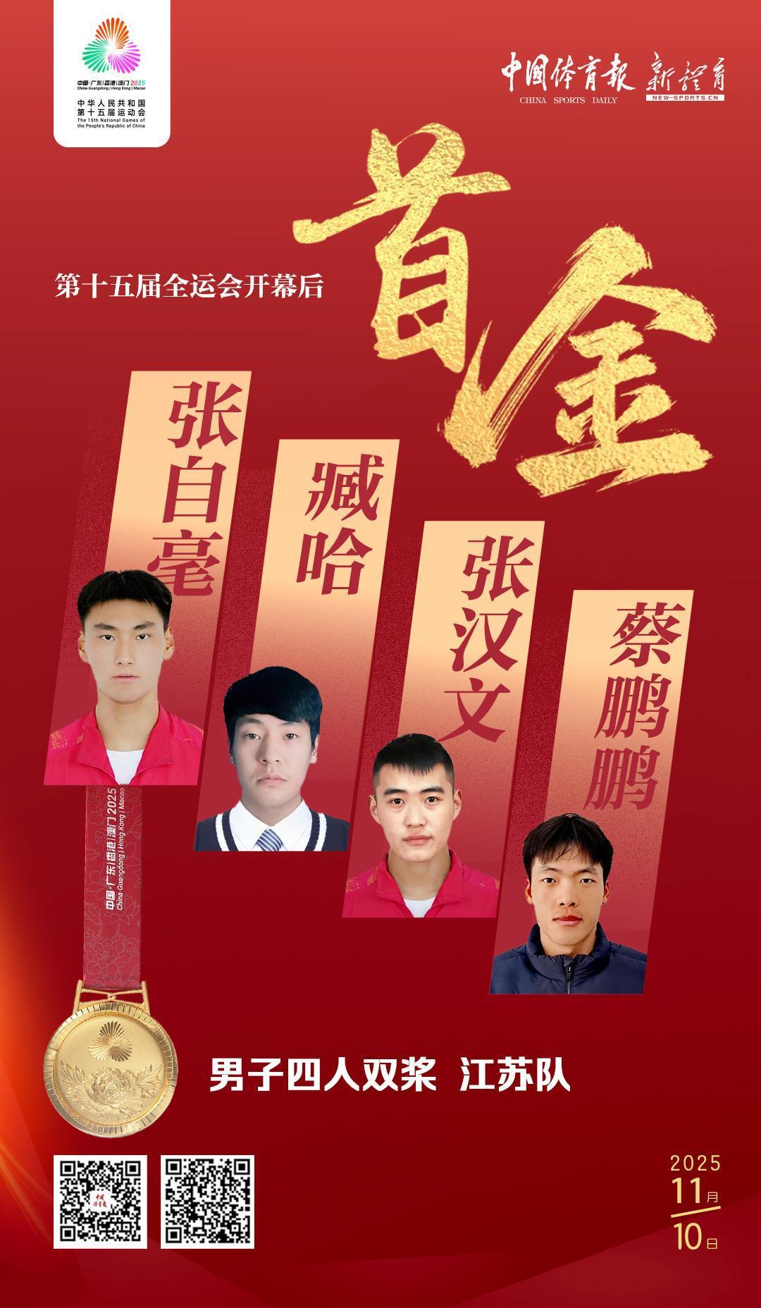 11月10日,江苏队在第十五届全国运动会男子四人双桨决赛中夺得冠军,这是十五运会开幕式后产生的首枚金牌。