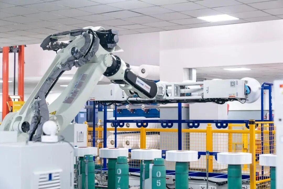 初冬时节,寒意渐浓,恒申集团的锦纶纺丝车间里却是一派火热的生产景象,自动化设备高速运转,机械臂灵活精准地,完成各项操作。雪白的丝束在光影交错间飞速卷绕,化作一排排整齐的纱锭。