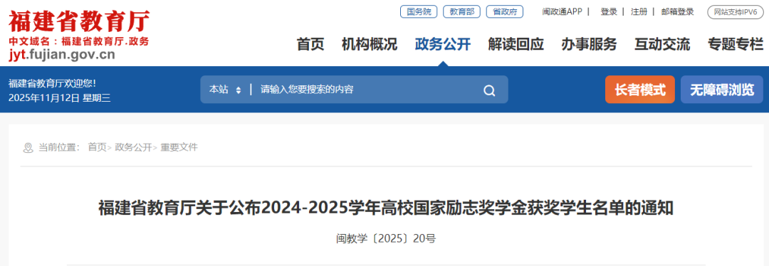 近日,福建省教育厅公布2024-2025学年高校国家励志奖学金获奖学生名单,每人奖励6000元,来看具体通知——