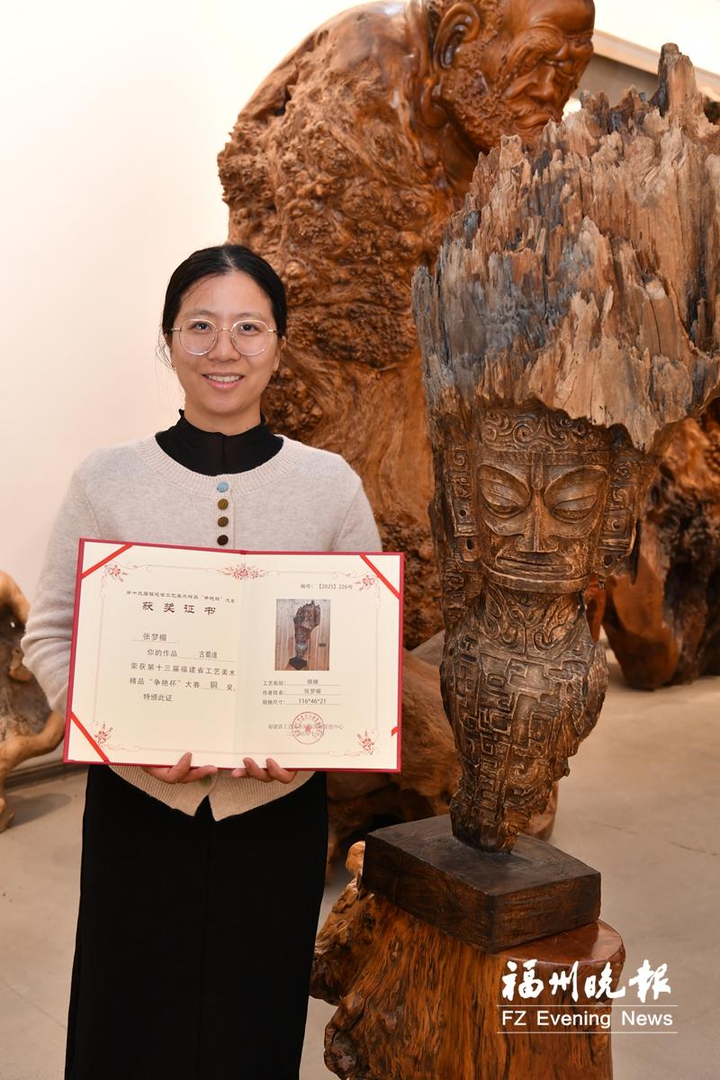 不久前,福建省工艺美术名人、福州市劳动模范张梦楣又添新荣誉,其木雕作品《负亲行》与《古蜀魂》在第十三届福建省工艺美术精品“争艳杯”大赛中分别斩获金奖与铜奖。从艺16年,这位福州姑娘在木雕世界里勇敢逐梦,闯出了自己的一片天。近日,记者采访了她。