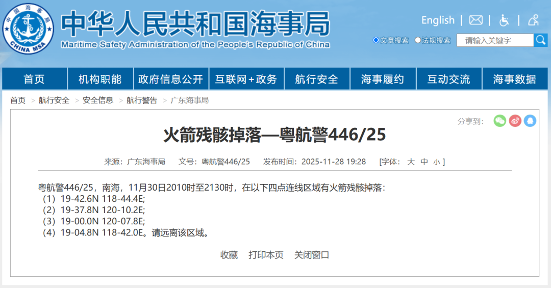 据中国海事局网站消息,广东海事局发布航行警告,11月30日20时10分至21时30分,南海部分水域有火箭残骸掉落,请远离该区域。