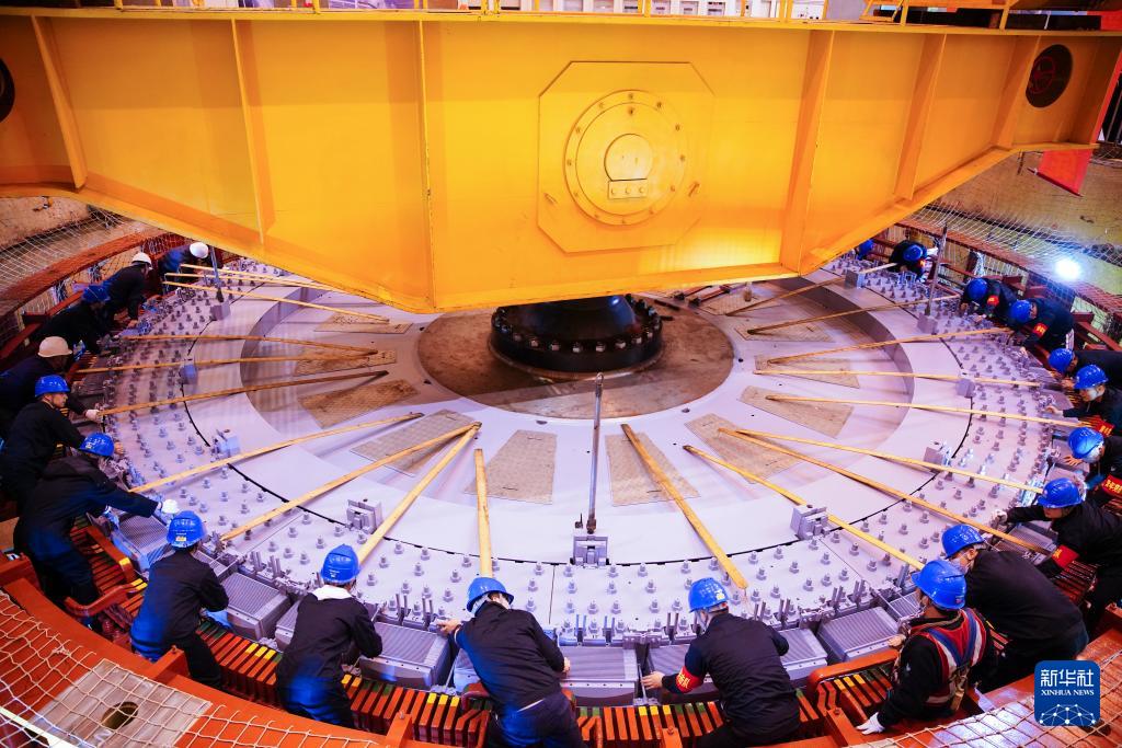 11月30日,检修人员将机组转轮吊装至安装间。新华社记者 周义 摄