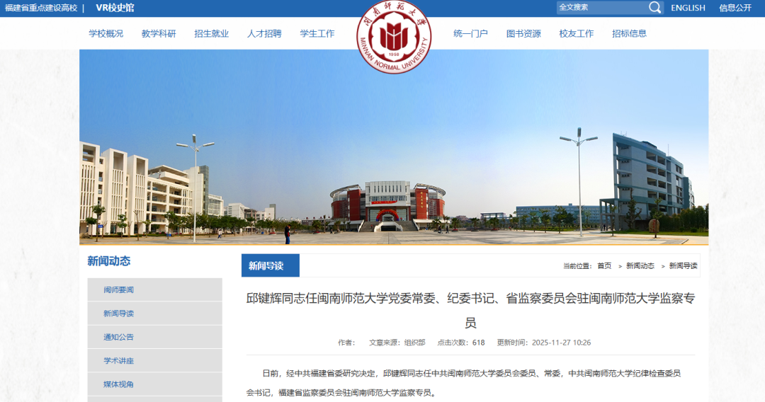 据闽南师范大学官网11月27日消息,日前,经中共福建省委研究决定,邱键辉同志任中共闽南师范大学委员会委员、常委,中共闽南师范大学纪律检查委员会书记,福建省监察委员会驻闽南师范大学监察专员。