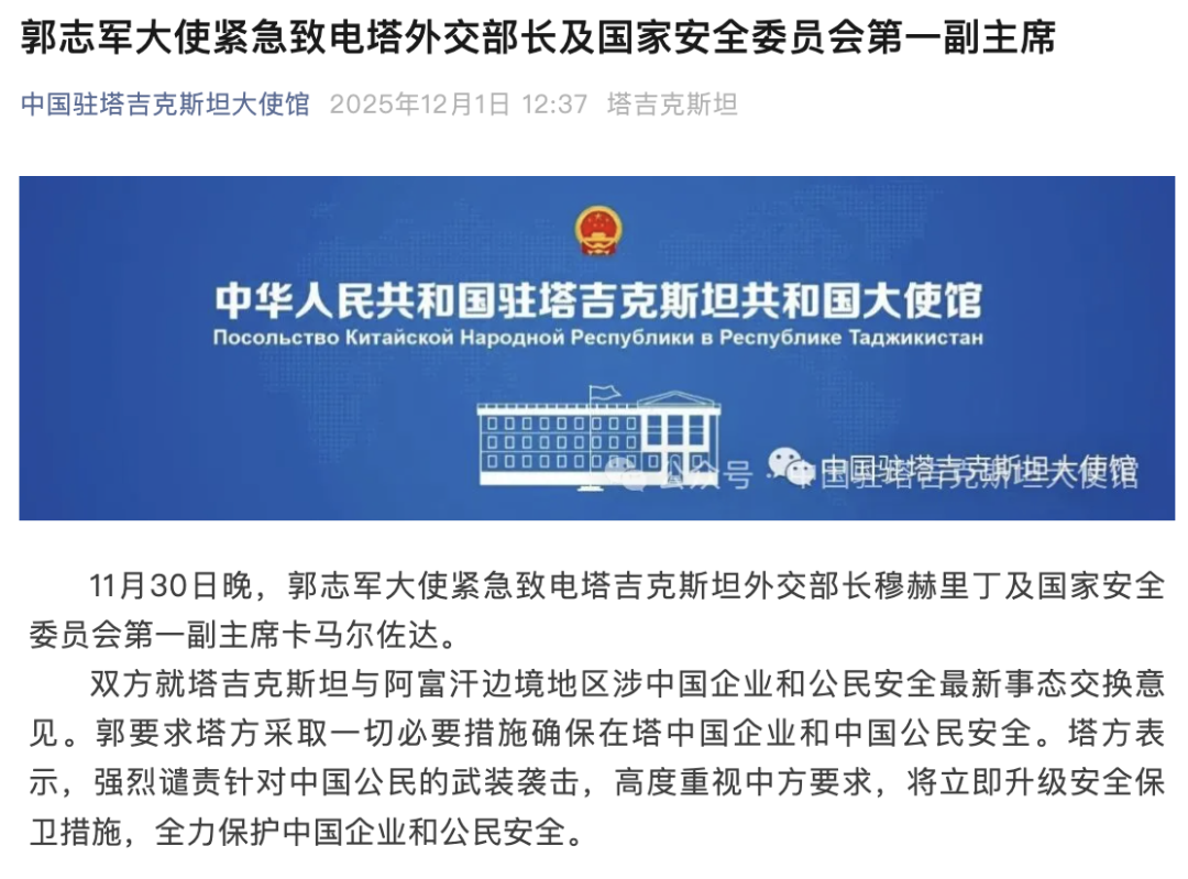 1日早些时候,中国驻塔吉克斯坦大使馆发布消息,11月30日晚,郭志军大使紧急致电塔吉克斯坦外交部长穆赫里丁及国家安全委员会第一副主席卡马尔佐达。