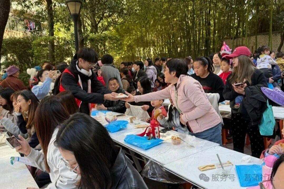 美食区域热闹非凡,志愿者和居民聚在一起,擀皮、填馅、捏褶,动作娴熟又默契。不熟悉技法的邻居主动请教,“你这褶子要捏紧点”“擀皮别太薄,不然容易破”,一来二去间,生疏感渐渐消散,欢声笑语伴着面团的香气弥漫全场。另外锅里的饺子、鱼丸翻滚沸腾,热气腾腾的香气勾得人食指大动。志愿者们穿梭在人群中,将刚出锅的美食和甜蜜的棉花糖送到大家手中,老人们边吃边唠家常,孩子们分享着福州小吃,一口烟火气,拉近了邻里间的距离。