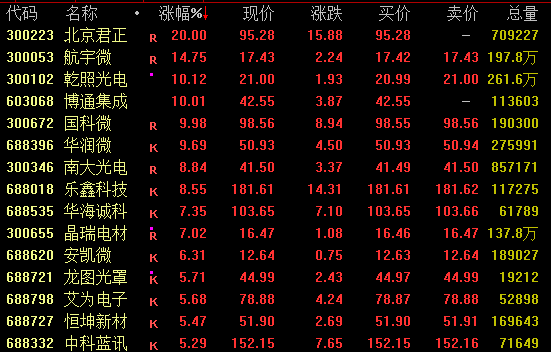 半导体板块午后强势拉升,光刻机、存储芯片概念亮眼,北京君正尾盘20%涨停。此外,容大感光涨近18%,航宇微涨超14%,博通集成涨停,国科微、南大光电、乐鑫科技等涨超8%。