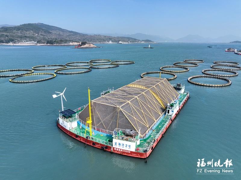 乘船来到筱埕镇定海湾的“海上牧场”。碧波之上分布着多个深远海养殖平台,科技感十足。登上比篮球场还大的“定海湾”系列平台,如履平地,一尾尾金灿灿的大黄鱼在网中翻腾跳跃,阳光下鳞片闪烁。在这里,渔民捕捞连江自主培育的“岱衢族”大黄鱼,让它们“游”向全国各地。