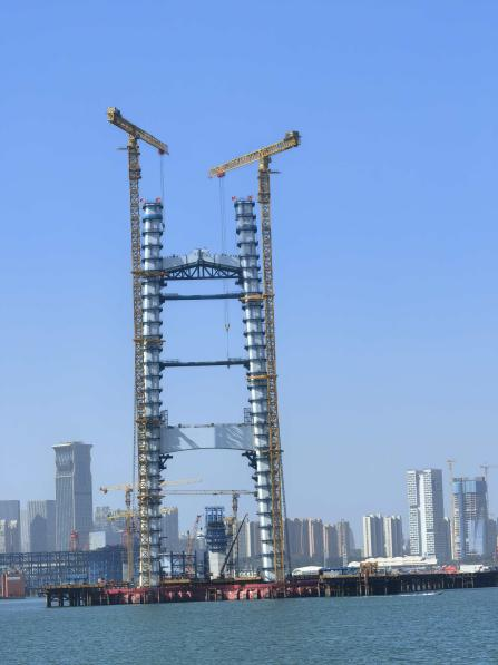 11月28日,厦金大桥关键控制性工程——刘五店航道桥主塔完成封顶,标志着大桥建设正式转入“悬索成桥”施工阶段。该桥为国内首座五跨连续三跨吊组合桥塔平面缆悬索桥,主塔高178.1米,主跨928米,是福建省内最大跨径桥梁。