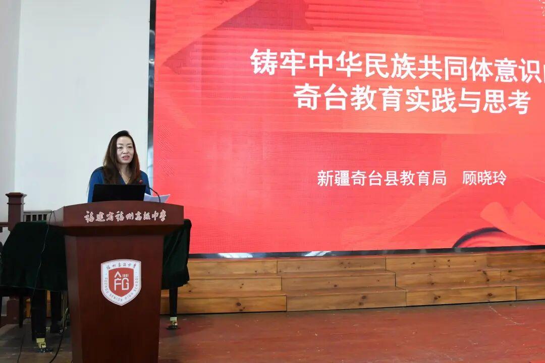 奇台县教育局思政科科长顾晓玲从机制保障、课程建构、文化浸润、资源增效、合作共建五个方面交流分享《铸牢中华民族共同体意识的奇台实践与思考》,详细介绍了奇台县在教育实践中引导学生增强“五个认同”的积极探索与有效经验。