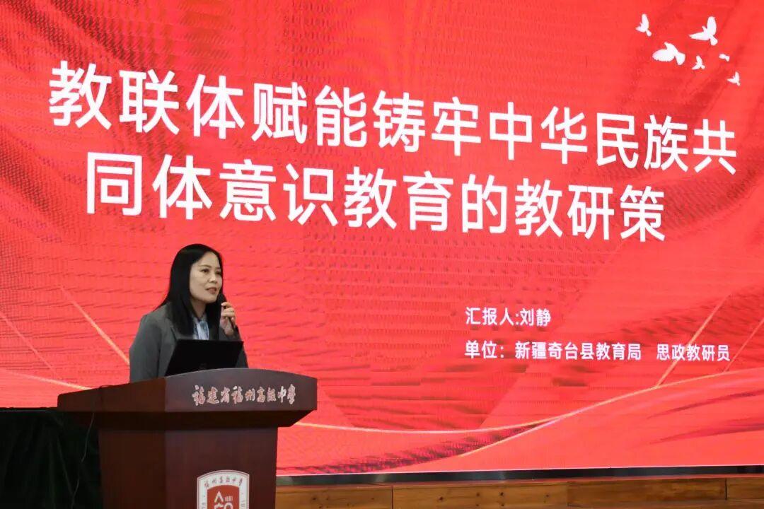 新疆奇台县教育工作服务中心思政教研员刘静从教研策略体系、课程教学赋能等方面分享了《“教联体”赋能铸牢中华民族共同体意识教育的教研策略》,深入探讨如何通过“教联体”这一新型教研组织形式,有效开展铸牢中华民族共同体意识教育。
