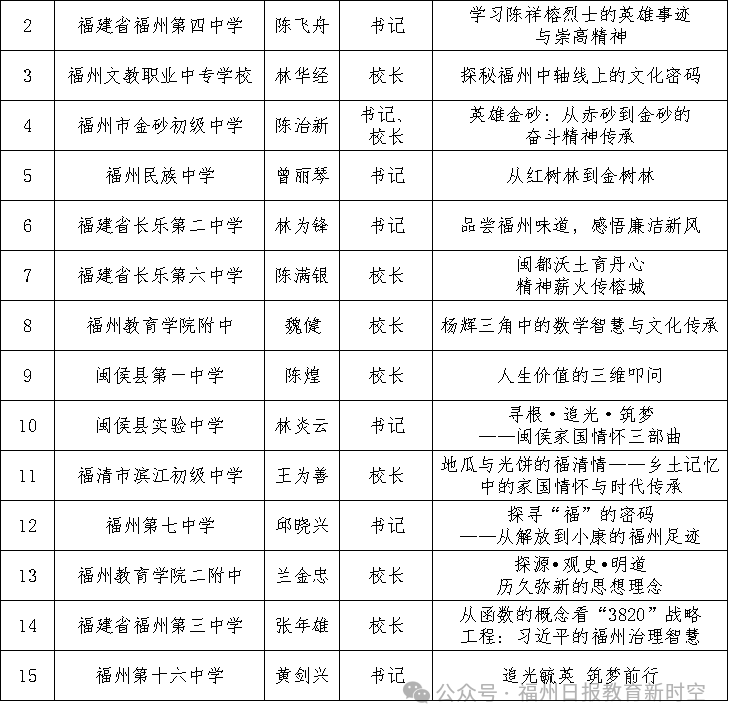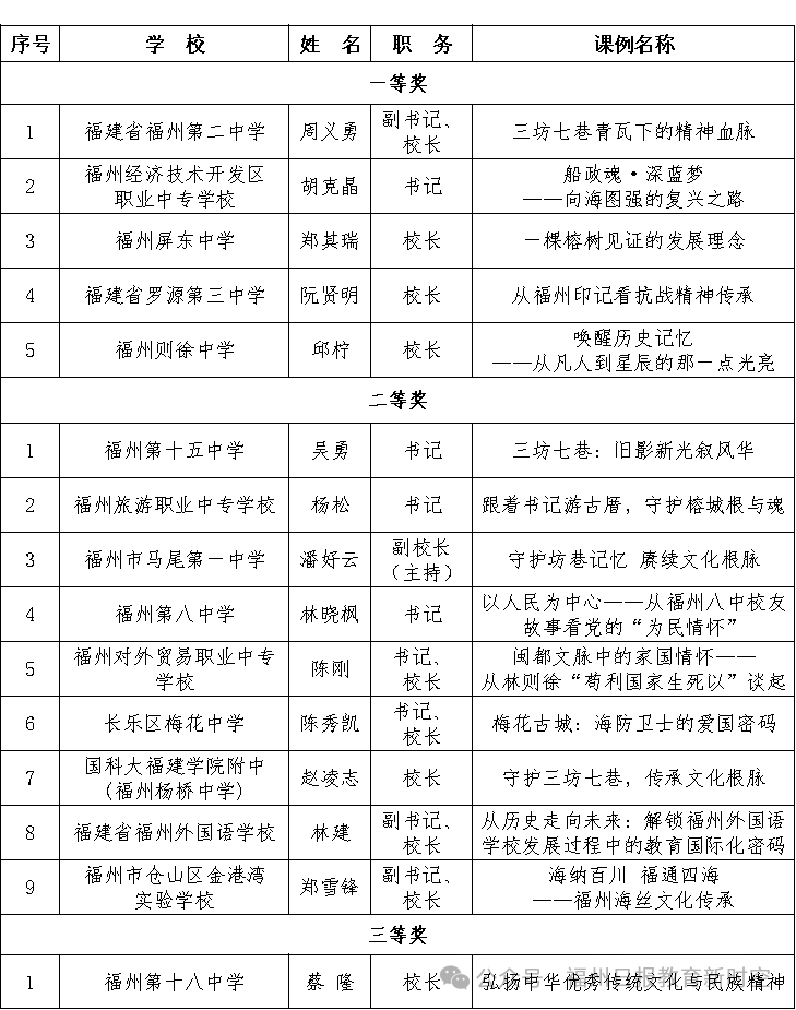 根据《福州市教育局关于举办福州市第二届中小学书记、校长“大思政课”教学展示活动的通知》(榕教思〔2025〕7号),经组织申报、专家评审、集体研磨、现场展示等程序,活动共评选出一等奖5名,二等奖9名,三等奖15名。现将获奖名单予以公布(见附件)。
