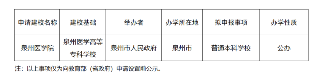 根据《中华人民共和国高等教育法》《普通高等学校设置暂行条例》《普通本科学校设置暂行规定》等有关规定,经福建省高等学校设置评议委员会专家考察和评议,现对拟向教育部(省政府)申报以泉州医学高等专科学校为基础设立泉州医学院事项予以公示。