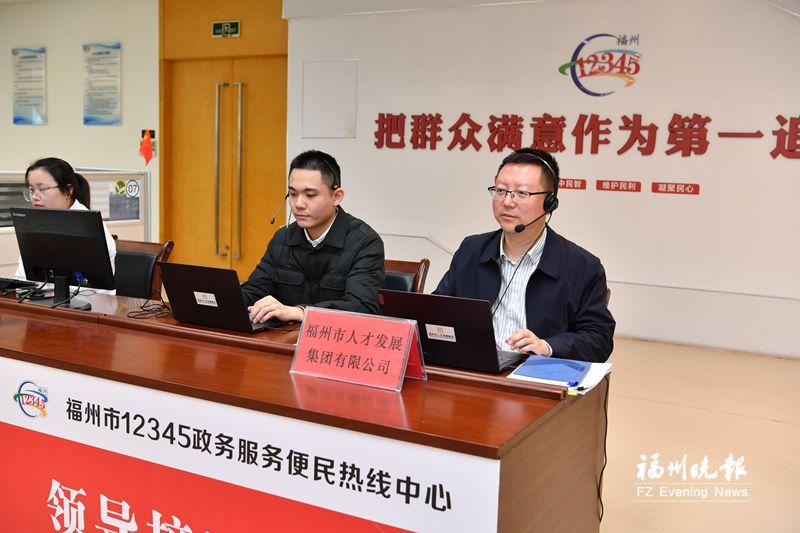福州市人才发展集团党委委员、副总经理白俊超(右一)接听12345热线。