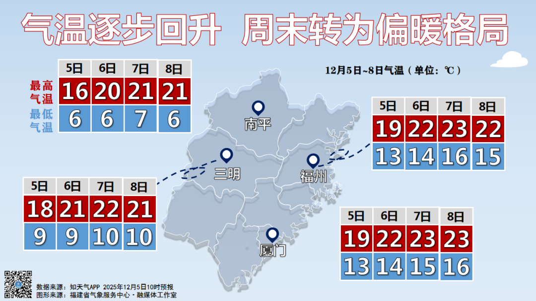 福建继续维持晴朗干燥模式,5日到11日,福建以多云天气为主。12~14日转为阴雨天气,其中,13日夜里起受强冷空气影响,气温将明显下降。