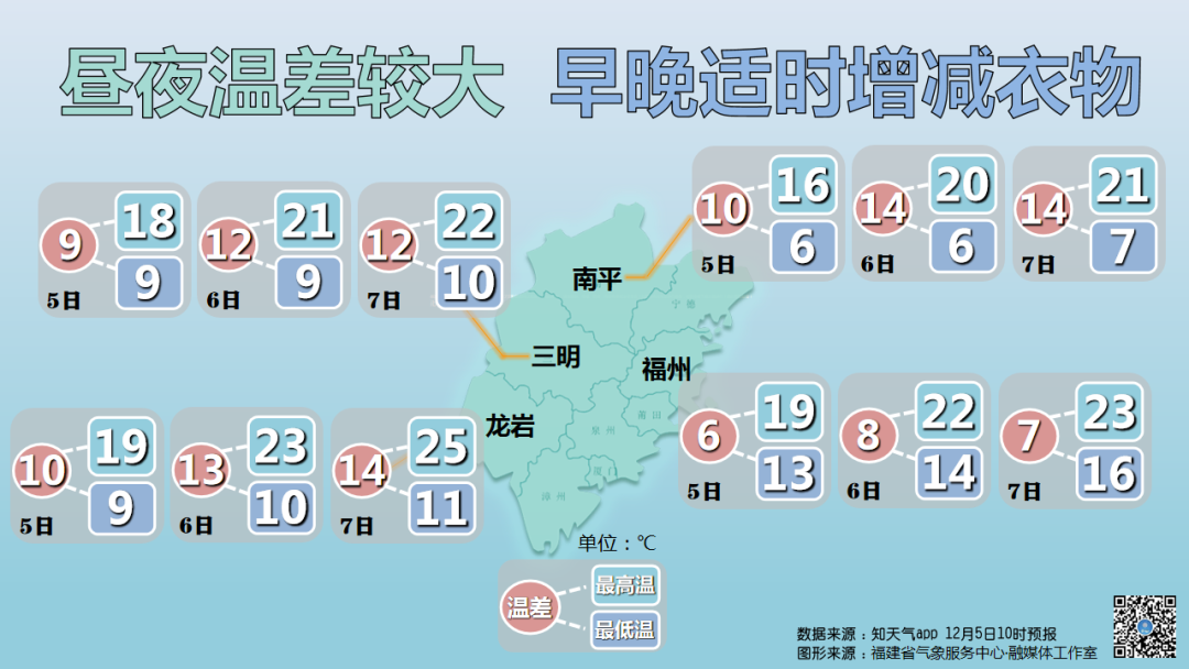 还需注意福建内陆地区最低气温保持平稳,早晚寒意明显,昼夜温差加大,部分地区昼夜温差或达10℃以上,早出晚归的朋友们需注意防寒保暖。