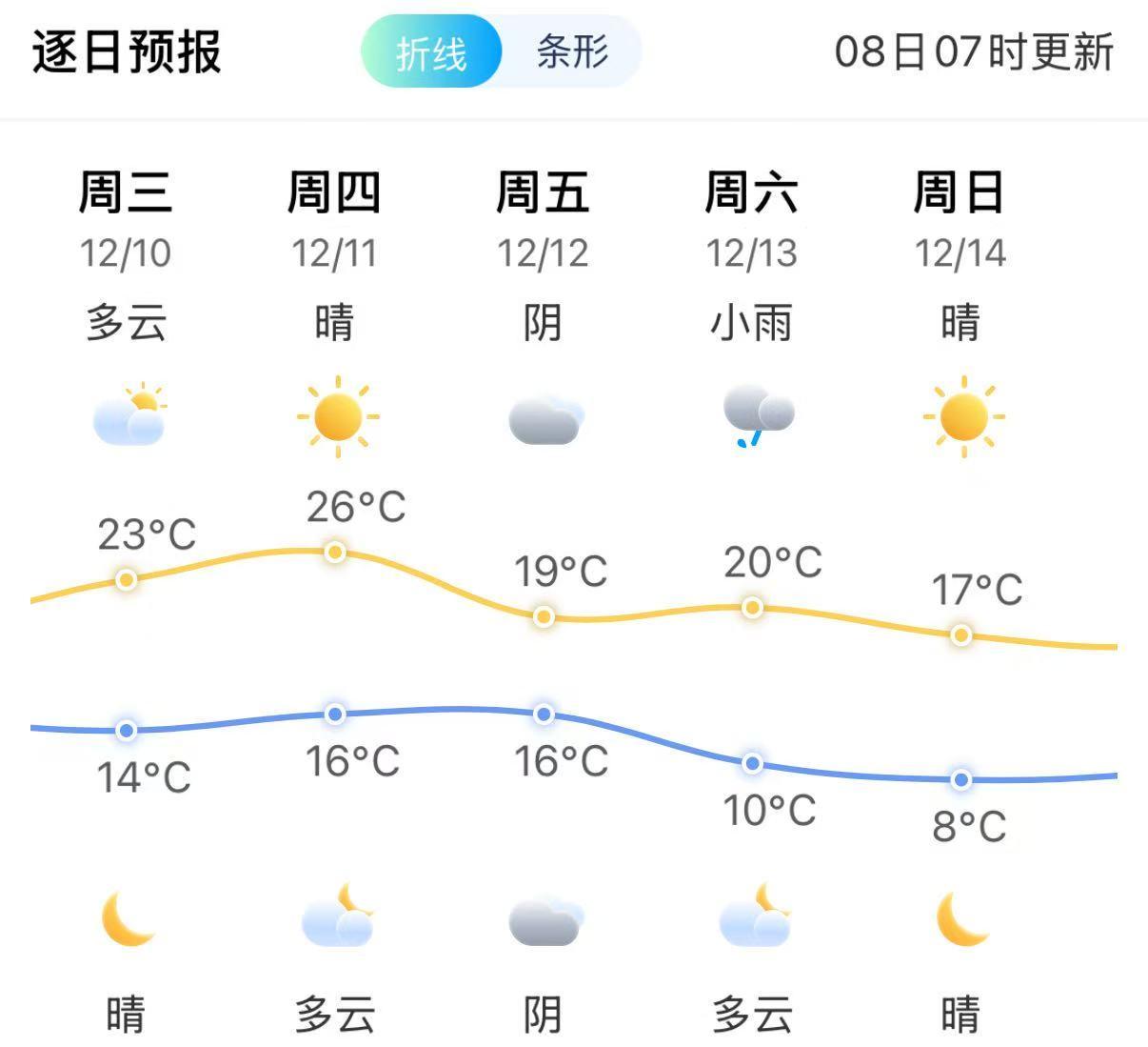 未来三天市区高温先降后升,低温在15℃左右,昼夜温差拉大,夜晨寒凉,要适当保暖。预计12日还将有新一轮冷空气接踵而至,周末最低气温或跌破个位数。市民多关注临近预报,根据气温变化调整穿着。