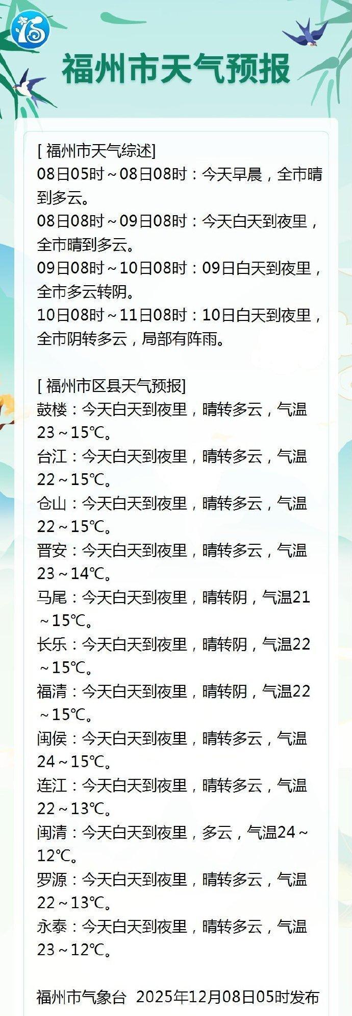 8日冷空气渗透,但强度不大,将给福州带来小幅气温波动。8日07时气温15.1℃,较7日升高1.0℃,西北偏西风1级,能见度11336米,相对湿度90%,天气晴转多云,气温23~15℃,东北偏东风3级。