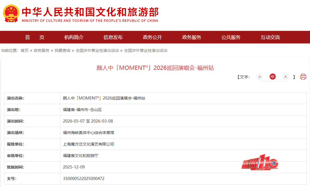 好消息!颜人中「MOMENTⁿ」2026巡回演唱会——福州站通过审批。