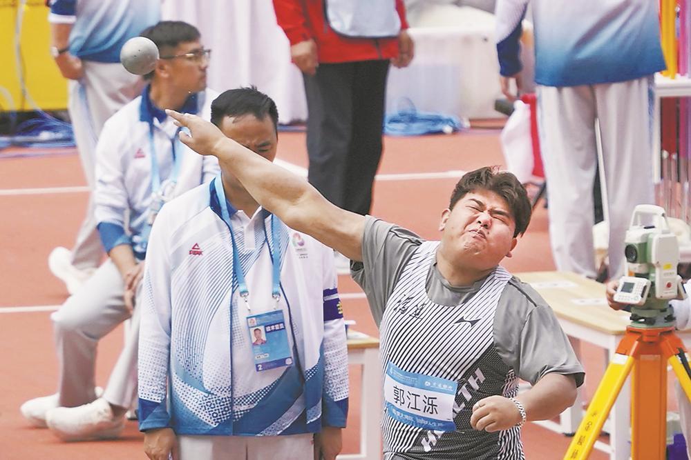 田径赛场福建运动员多点开花。当日,在残奥田径女子标枪F56级决赛中,老将赖小娟奋力一掷,以24.09米的优异成绩获得金牌并打破全国纪录。在女子听障组100米栏个人决赛中,林芷琴以14.86秒第一个到达终点,夺得金牌。郭天赐在男子跳高T64级决赛中以1.79米夺冠。郭江泺(左图)在男子铅球F37级决赛中以13.33米夺得金牌。