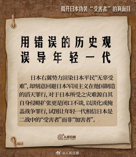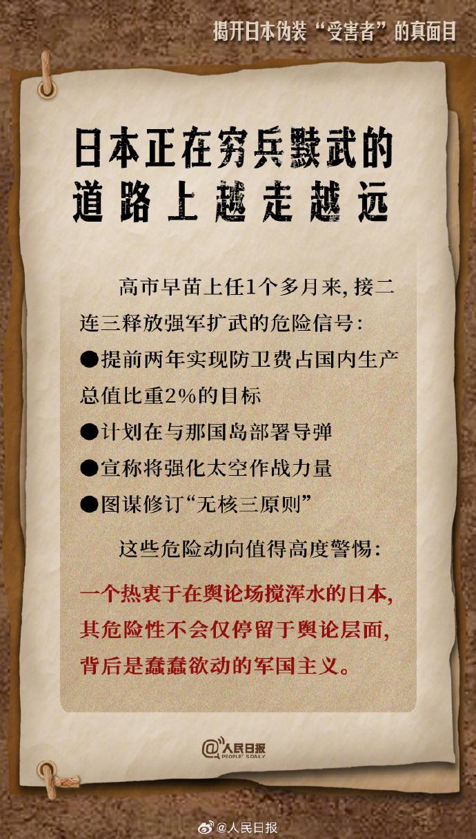 以“受害者”为借口发动侵略战争、用“受害者”谎言炮制虚假叙事、以“受害者”身份翻案历史突破现状……日本正在穷兵黩武道路上越走越远,这些危险动向值得高度警惕:一个热衷于在舆论场搅浑水的日本,其危险性不会仅停留于舆论层面,背后是蠢蠢欲动的军国主义。